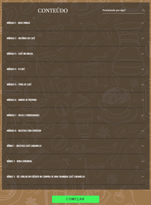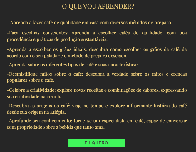 O curso é ideal para quem ama café, mas também ama conforto 🛋️☕. Tudo explicado passo a passo, com linguagem fácil, sem complicação e sem aquele papo técnico que dá sono 😴❌. Aqui o aprendizado é leve, gostoso e viciante — igual cafezinho recém-passado! 🤭🔥