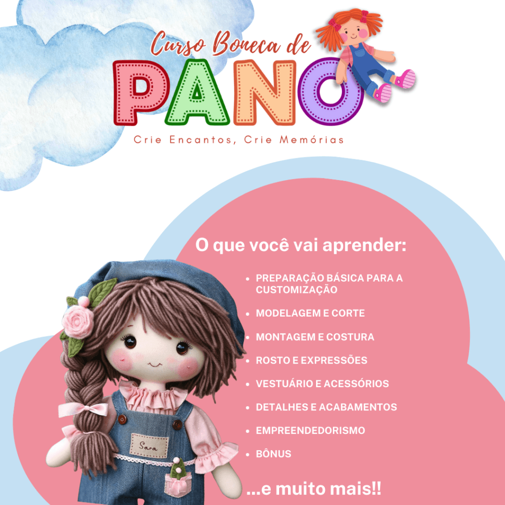 Você já imaginou poder criar bonecas tão fofas que até adulto quer abraçar? 😍🎀 Aquelas bonequinhas que parecem ter alma, olhar doce e personalidade… tudo feito por você com tecido, linha e um toque de magia! ✨ Pois, prepare-se, porque o Curso Boneca de Pano vai abrir as portas desse mundo encantado! 🧚♀️💕