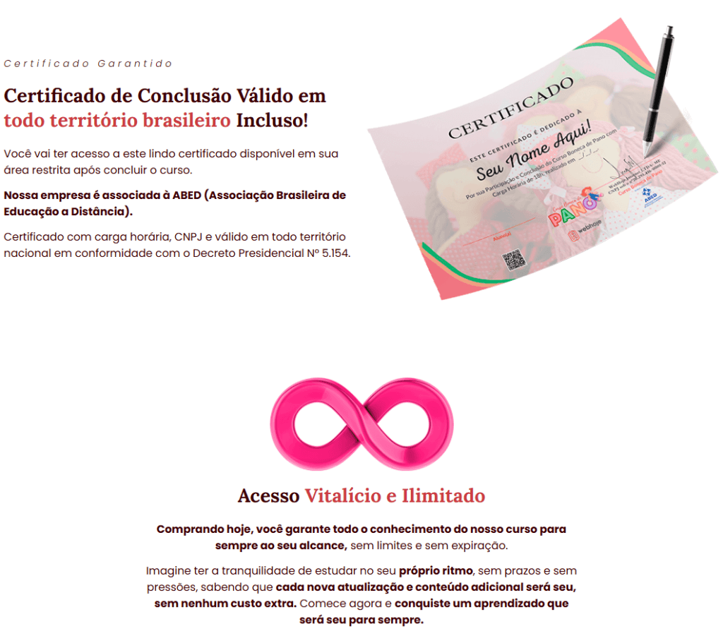 E o melhor de tudo? ☀️🌞 Você tem acesso imediato, certificado de conclusão e pode aprender no seu ritmo, sem correria, sem pressão… só você, suas linhas, suas bonecas e aquele sentimento delicioso de estar construindo algo lindo com as próprias mãos. ✨💖