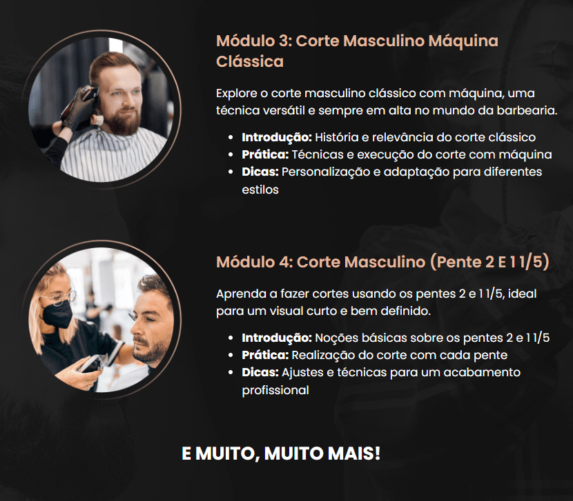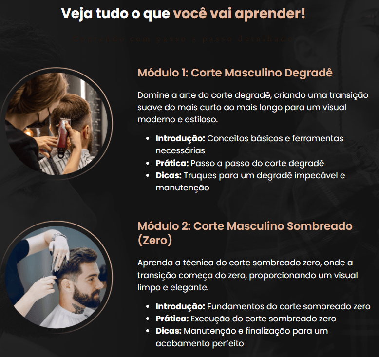 Com um método claro, organizado e totalmente prático, o aprendizado acontece mesmo para quem começa do zero. As vídeo aulas explicam cada detalhe, desde o uso correto da máquina e tesoura até os cortes mais pedidos nas barbearias modernas. 📚✨ Tudo é mostrado com clareza para que o conhecimento vire segurança nas mãos.