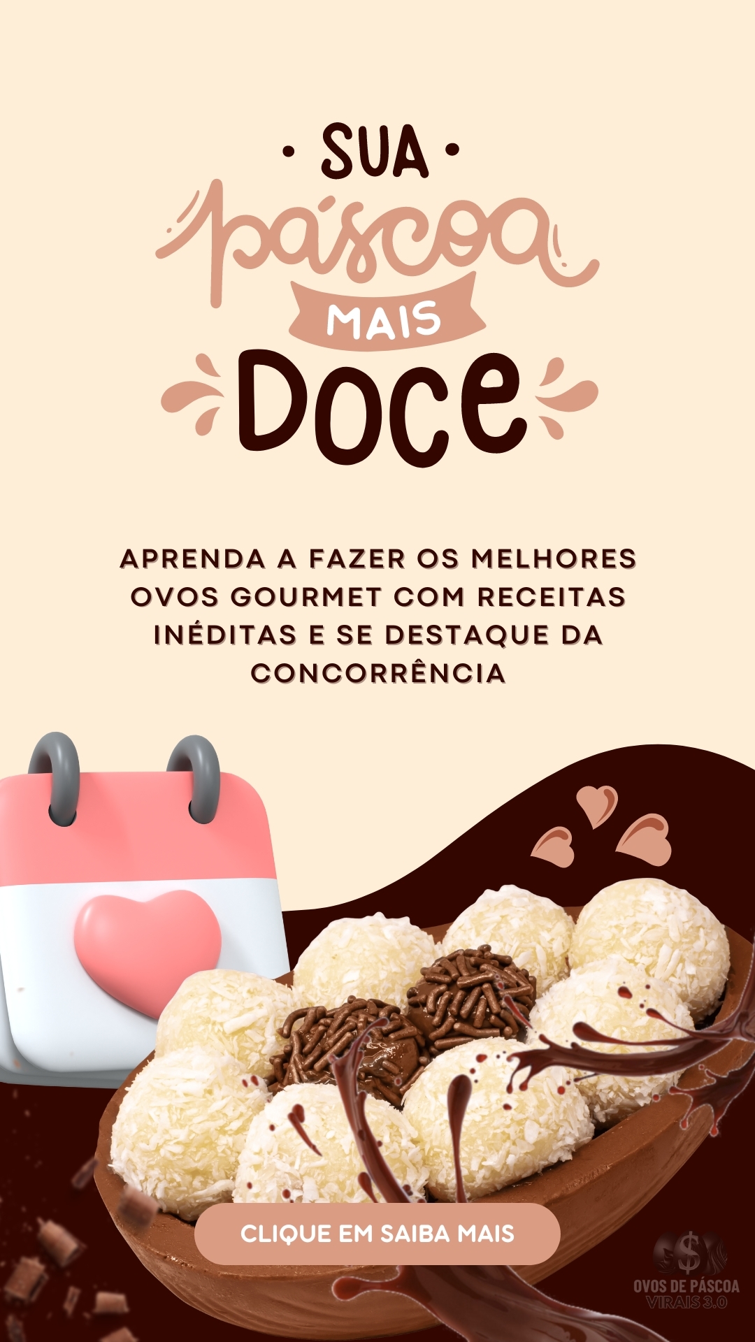 São mais de 25 receitas de ovos de Páscoa gourmet + 8 bônus exclusivos, com ideias criadas no Brasil e no mundo 🌍🍫. É o tipo de conteúdo perfeito pra quem quer faturar bem nessa Páscoa e finalmente dizer: “essa data agora é minha!” 🐰💰✨ Adquira seu Curso Ovos de Páscoa Virais 3.0 agora, já, e garante uma ótima renda extra.
