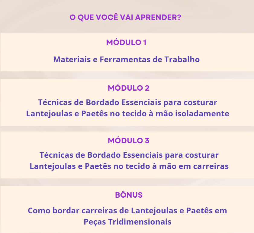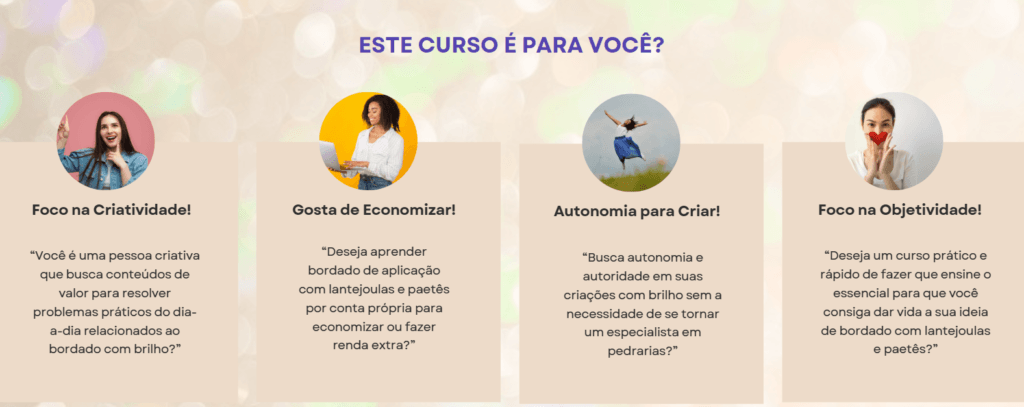 O curso ensina a colocar brilho em tudo! Dá para bordar a sapatilha velha, a bolsa que estava encostada e até o abajur da sogra (se ela deixar, claro! 😜). 💡👜 É tanta coisa linda que dá vontade de sair bordando até para o cachorro! 🐶O curso é leve, cheio de piadinha e sem aquelas palavras difíceis que dão nó na cabeça. 🚫 A ideia é descomplicar: se a linha deu nó, a gente desata; se o paetê caiu, a gente junta e segue o baile! O importante é sentir aquele quentinho no coração de ver uma peça pronta e dizer: “Fui eu que fiz, tá bom, meu amor?” ❤️👑